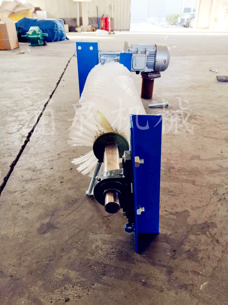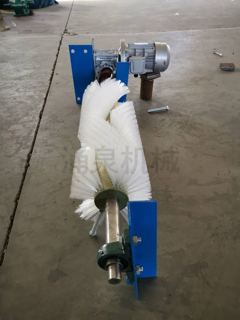 旋轉(zhuǎn)式清掃器位于輸送機(jī)回程輸送膠帶下方,有電動(dòng)機(jī)或者驅(qū)動(dòng)滾筒驅(qū)動(dòng)圓柱型清掃刷,刷尖與帶面輕微接觸,清掃刷的旋轉(zhuǎn)方向與回程輸送帶的運(yùn)行方向相反,從而將粘在帶面上的微料刷掃下來,達(dá)到徹底清潔的目的。