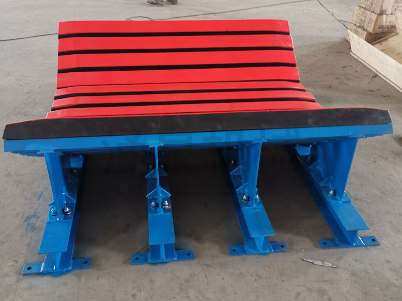 緩沖床主要有緩沖條、加強槽鋼、支架及連接件等組成。緩沖條由緩沖膠條和超高分子量聚乙烯經(jīng)特殊工藝硫化而成。緩沖膠條由骨架和橡膠熱硫化而成,骨架由特型鋁合金制成,骨架主要用來提高緩沖條的強度和連接。加強槽鋼起支撐和保護緩沖條的作用。支架是根據(jù)皮帶機的規(guī)格大小、皮帶的槽型角設計制作,用來托住和固定加強槽鋼、緩沖條;最終架設在皮帶機機架上。